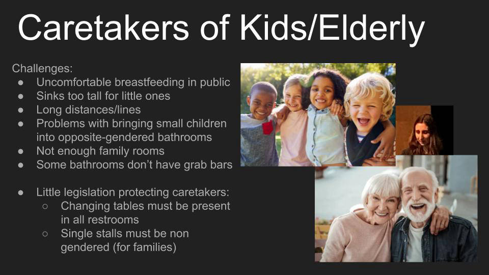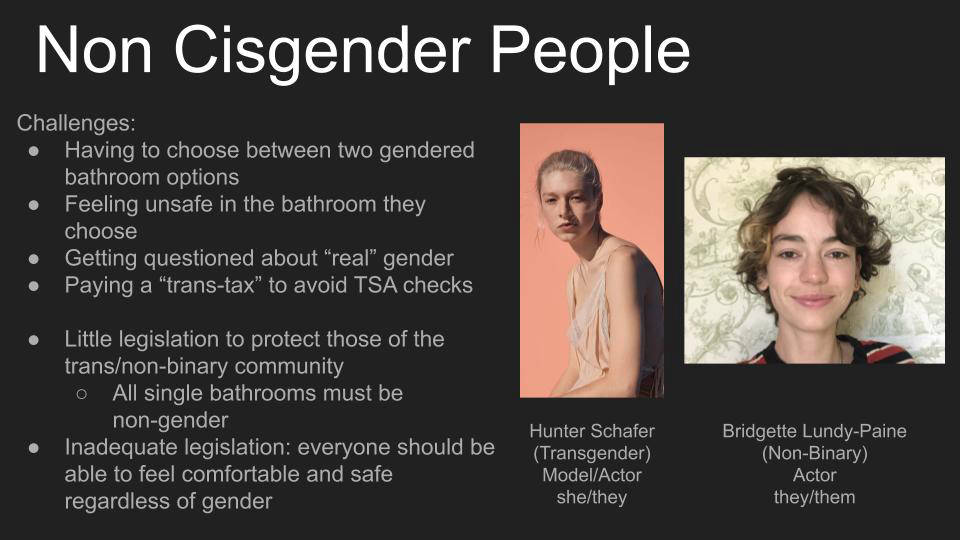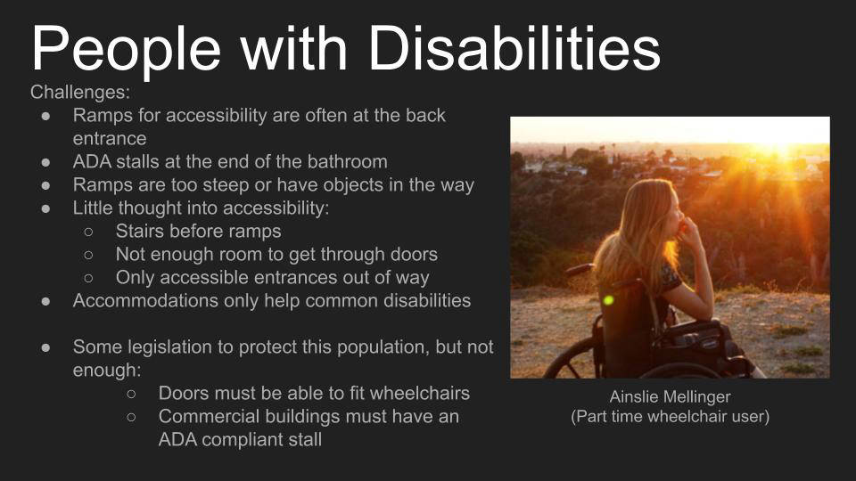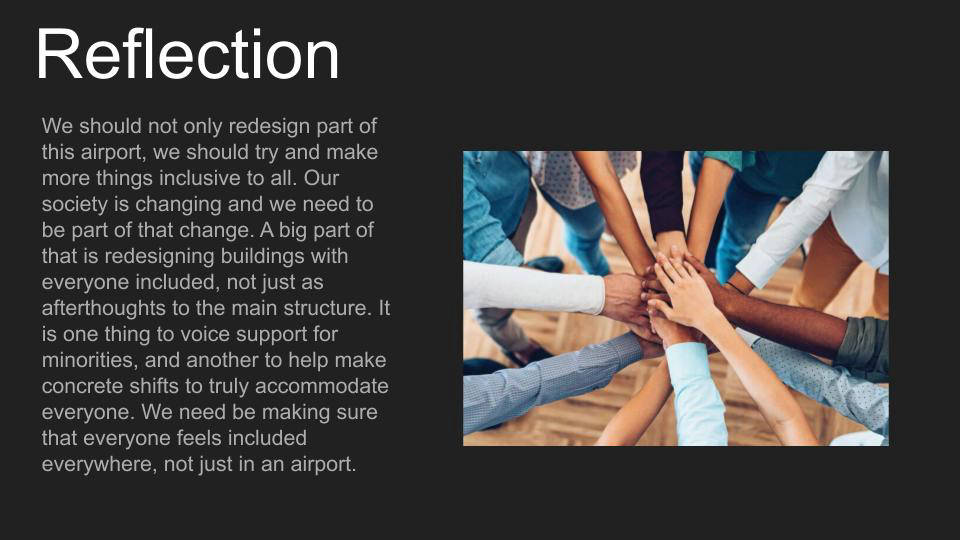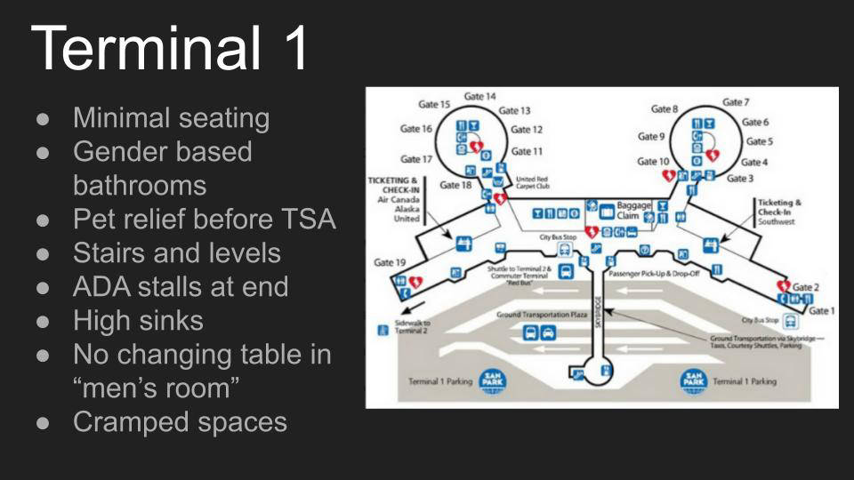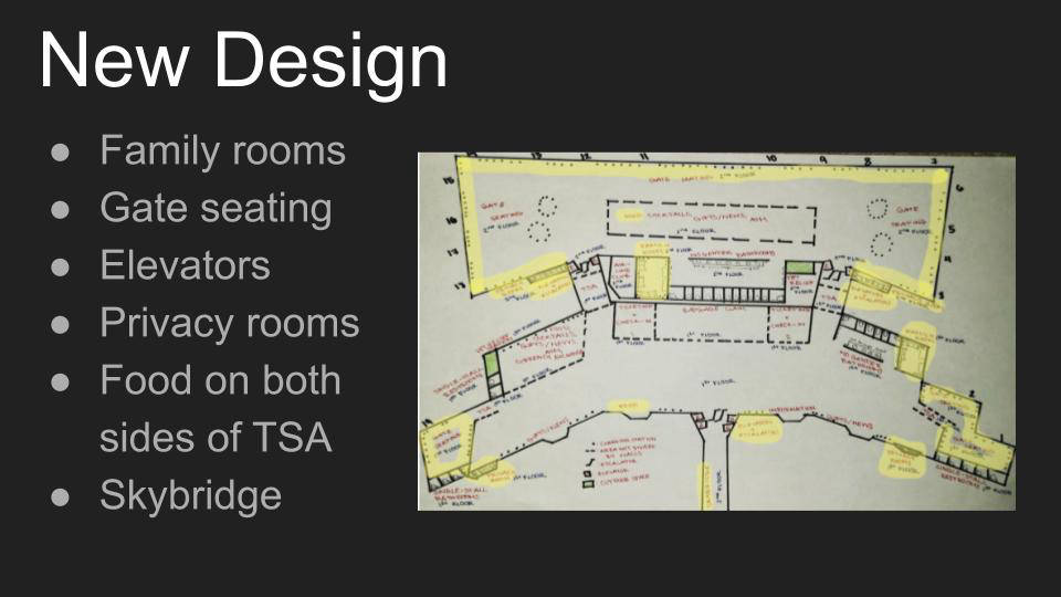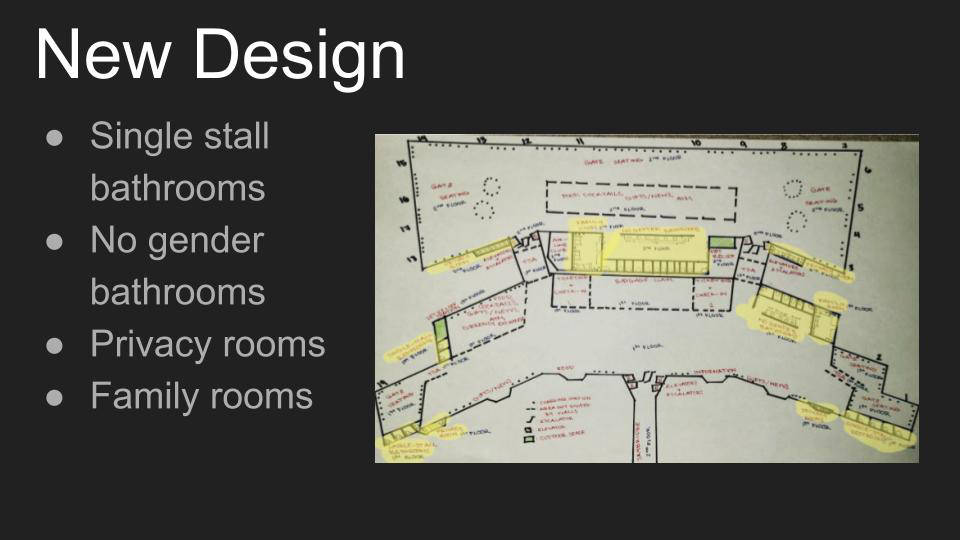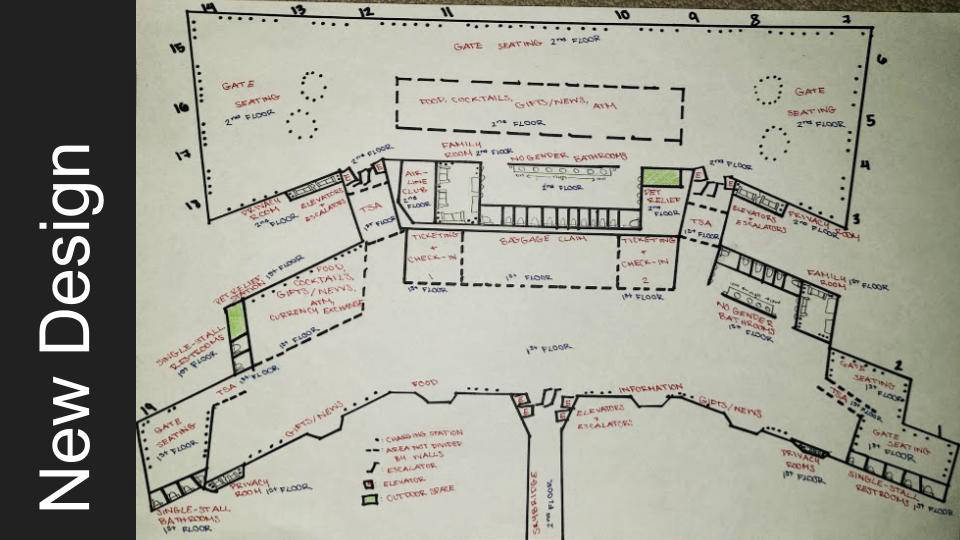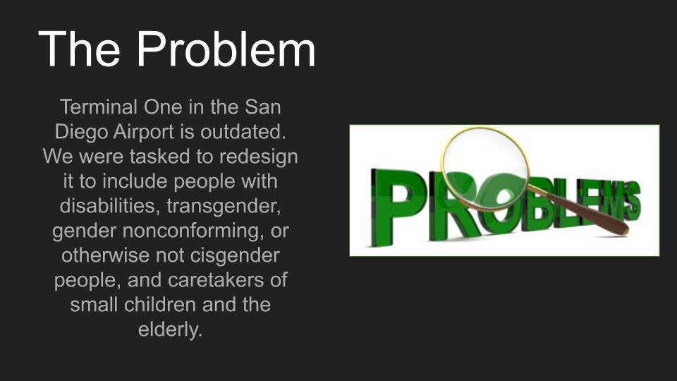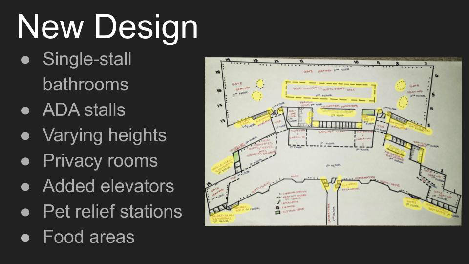 In Emily Moy's class, students completed a project called "Architecture for All," in which they redesigned SAN airport terminal 1 to be more inclusive, particularly considering the following groups: people with disabilities, people who are transgender, non gender binary or otherwise non cisgender, and caretakers of the young and elderly.